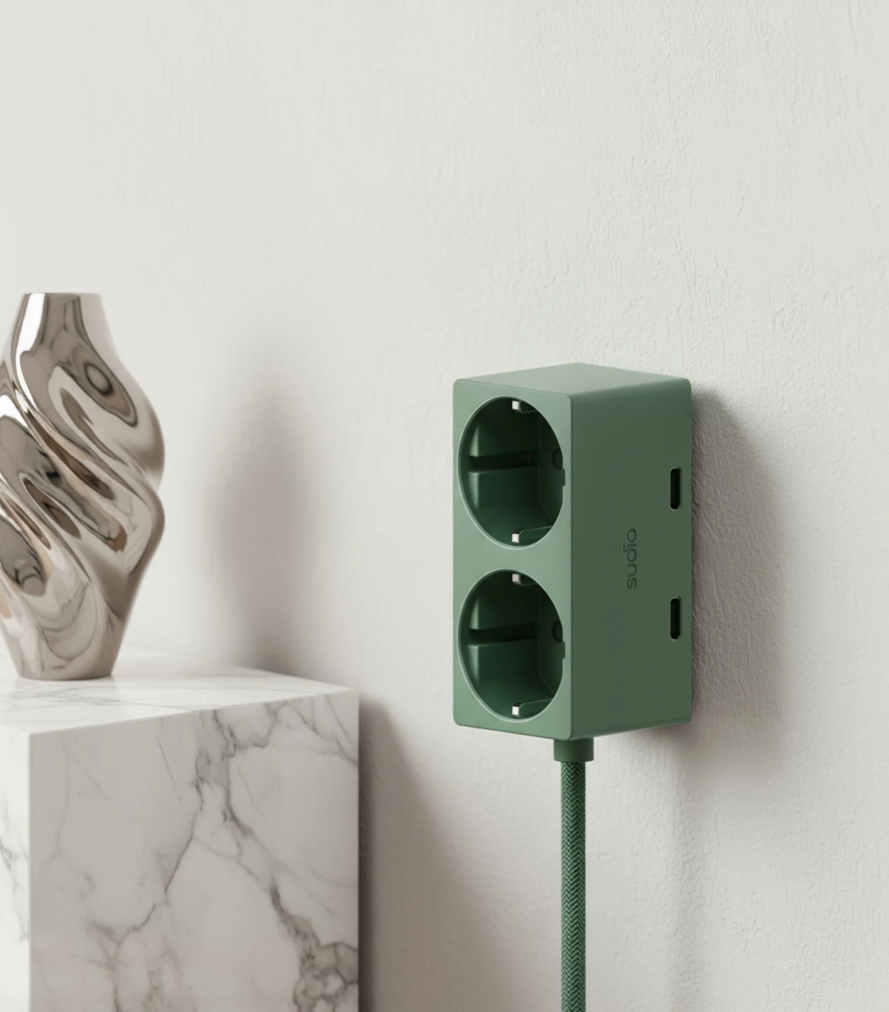 Brick is Sudio's answer: a charging hub and extension cord in four colourways, with two outlets, two USB-C ports, and a keyhole mount that lets it live on a wall as easily as a desk or floor. The form is deliberately compact and geometric, making it something you'd place rather than tuck away. Designed for the mass market without compromising on finish.